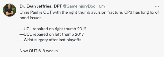 保罗右拇指骨折伤停6-8周!常规赛或报销,联盟第一遭受沉重打击