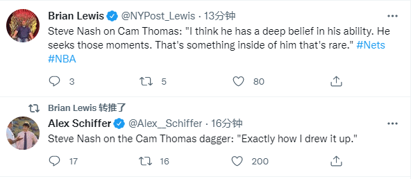 篮网逆转赢球赛后,杜兰特连续发推庆祝,先是发推写道:篮网球迷们在巴克莱中心很闹腾啊,哦,我的意思是今晚在麦迪逊花园球馆;然后杜兰特又发推:这就是今晚24号带领我们的方式(24号代指篮网新秀托马斯)。