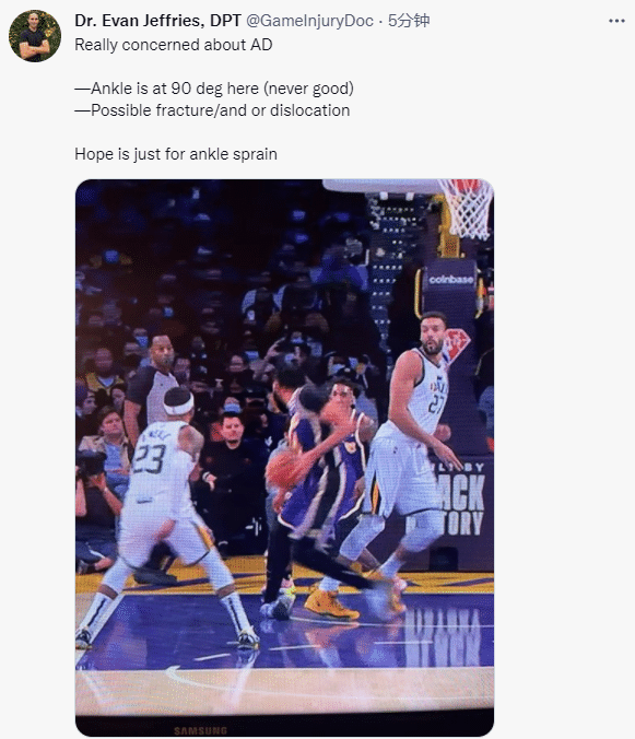 对于浓眉受伤一幕,医学专家evan Jeffries发推分析,浓眉脚踝90度扭伤不太好,可能是脚踝骨折或者脱臼,希望仅仅只是扭伤;医学专家详解伤情,一级扭伤伤停1-2周,二级扭伤伤停2-4周,三级扭伤伤停6-8周。