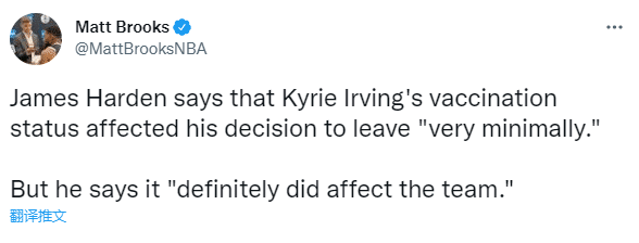 再次谈到欧文拒绝接种疫苗,哈登:欧文不打疫苗的事情,占我想来到费城非常小的因素而已,我和欧文两个人还是好朋友;但像他这种情况,肯定影响到了整支球队。