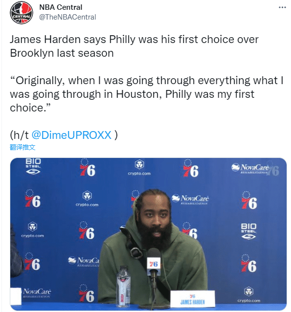 哈登身穿绿色连帽卫衣出镜,在发布会上,哈登表示当初离开火箭时他没有自主选择下家的权利,直言:当初我准备离开火箭时,费城本就是我的首选,只不过这在当时没能发生。