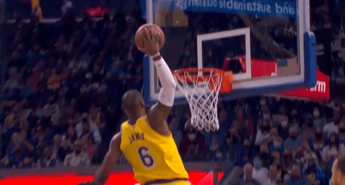暂停期间,湖人助教菲尔-汉迪吃到技术犯规,库里执行技犯罚球,詹姆斯造维金斯犯规却两罚不中,勇士一波5-0打停湖人,5分22秒詹姆斯下场休息。
