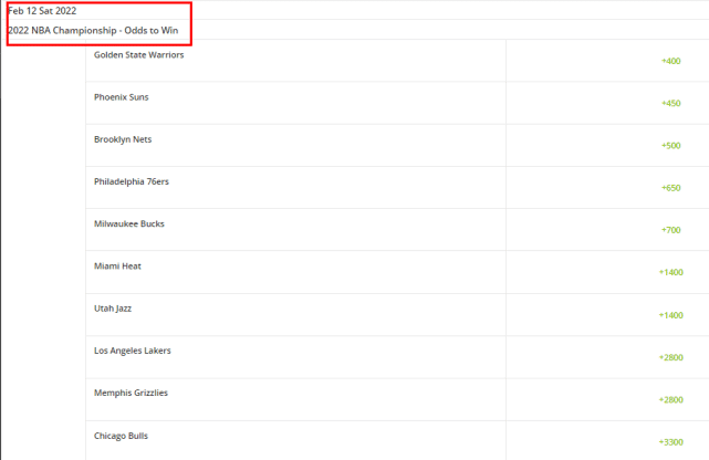 最新夺冠赔率排名前十位的球队如下:勇士(+400)、太阳(+450)、篮网(+500)、76人(+650)、雄鹿(+700)、热火(+1400)、爵士(+1400)、湖人(+2800)、灰熊(+2800)、公牛(+3300)。