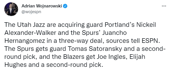 来源:24直播网02-10 18:0224直播网02月10日讯 ,NBA又有一笔大交易达成,据ESPN名记沃纳罗斯基报道,爵士、马刺和开拓者达成一笔三方涉及多人大交易,具体的交易细节是爵士得到亚历山大-沃克、胡安-埃尔南戈麦斯;马刺得到萨托兰斯基和一个次轮选秀权;开拓者得到英格尔斯、伊莱亚-休斯和一个次轮选秀权。