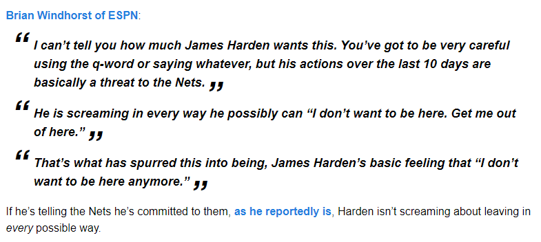 温德霍斯特在节目中表示:我无法告知你哈登有多想被交易离队,他以各种可能的方式尖叫“我不想在这里,让我离开这里”,这就是导致这一切发生的原因,哈登现在的基本感受是“我再也不想待在这儿”。