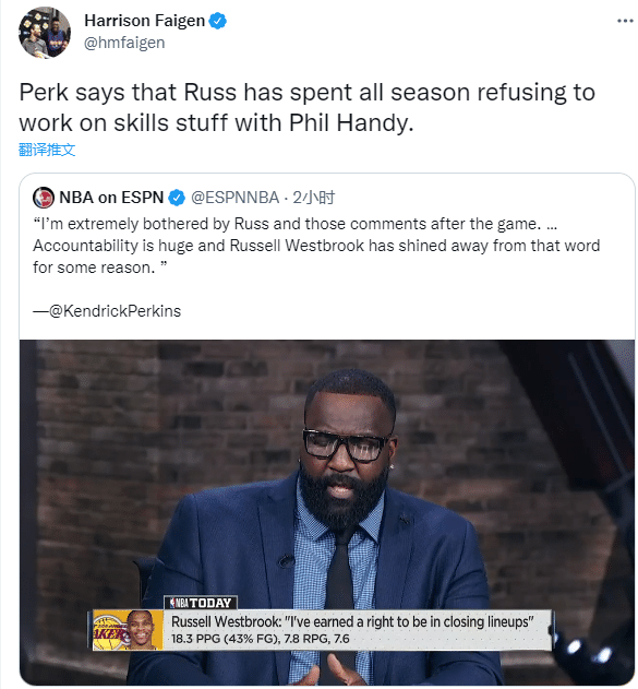 帕金斯还表示整个赛季以来,威少拒绝和湖人助教菲尔-汉迪一起训练。