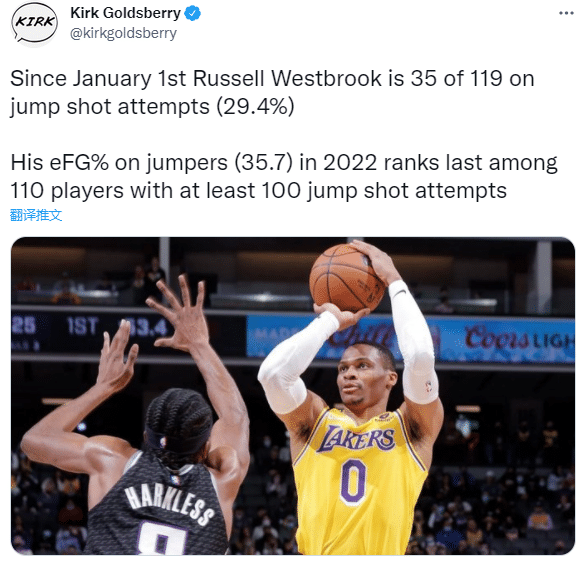 据统计,自从2022年1月份以来,威少总共119次跳投命中35球,命中率仅仅只有29.4%,跳投有效命中率是35.7%,在至少跳投100次的110名球员中排在联盟倒数第一。