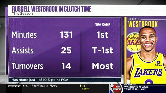 24直播网02月10日讯 ,上一场湖人惨败雄鹿,威少整个第四节都被按在替补席上,本赛季第3次关键时刻遭弃用,那么威少关键时刻的数据如何?上场时间、助攻和失误都是联盟第一,一数据联盟倒数第一。