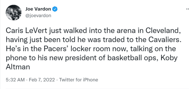 有趣的是这笔4换2交易协议达成在两队今日交锋之间,据前方记者报道,勒维尔刚走进骑士的球馆,就被告知他被交易到骑士队,他目前在步行者的更衣室里,和他的新篮球主管科比-奥尔特曼打电话。