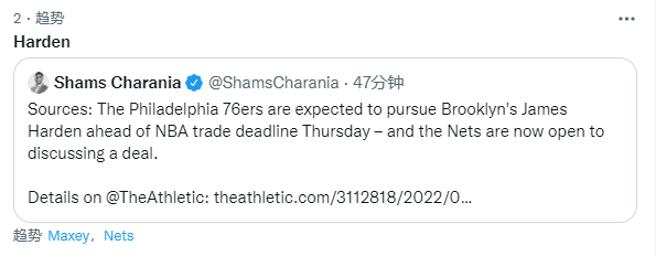 篮网开启哈登交易谈判引热议,瞬间冲上推特热搜第二名;去年休赛期,哈登拒绝和篮网提前续约,如今哈登在篮网总共才打了80场比赛,由于种种原因,篮网已经开始尝试交易哈登。