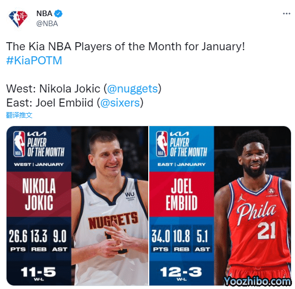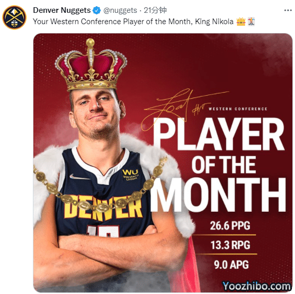 掘金官方第一时间祝贺约基奇,发推晒照写道:您的西部月最佳球员,尼古拉国王。