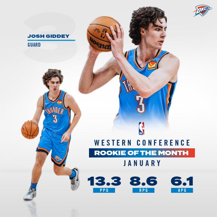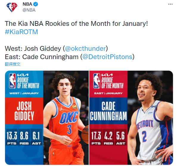 今年1月份最佳新秀得主,雷霆6号秀基迪(西部)和活塞状元郎康宁汉姆(东部)分别当选,其中前者连续3个月获得此奖项。