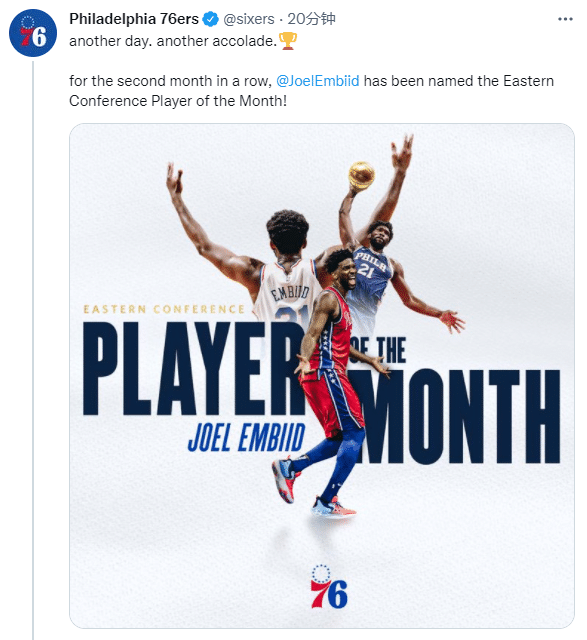 恩比德在1月份率领76人取得12胜3负的战绩,场均得到34.0分10.8篮板5.1助攻,恩比德生涯第4次当选,连续两个月当选东部月最佳创纪录,成为76人队史第一位连续两个月获得东部月最佳的球员,也成为艾弗森之后队史一位至少4次获得月最佳的球员。