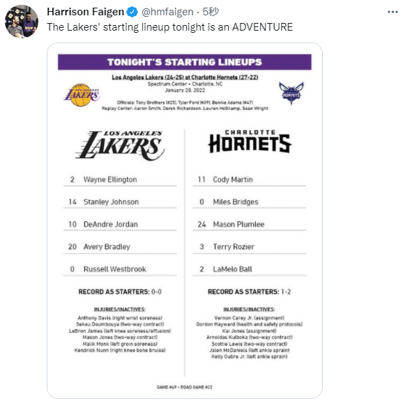 另外值得一提的是,一周前ESPN把湖人与黄蜂的比赛该为全美直播,取代了老鹰的比赛,可今天詹姆斯和浓眉两大巨星都因伤无法出战。
