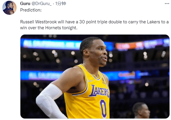 詹姆斯和浓眉都因伤休战,湖人再次变阵,沃格尔安排艾灵顿和小乔丹顶替詹眉首发,威少、布拉德利和约翰逊继续首发;湖人三巨头仅剩威少,神龟有望打出一场疯狂的表现,球迷预测威少能轰下30+三双并且带队赢球。