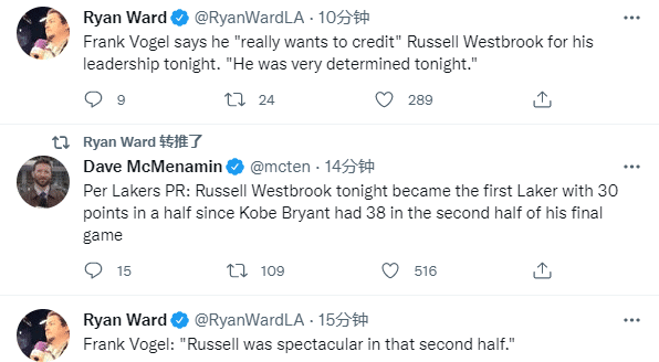 威少全场轰下35分仅仅只有1次失误,得分创湖人生涯新高,下半场30分成为科比退役战后湖人首位做到的球员;虽然威少错失绝杀三分,但神龟虽败犹荣,下半场扛起重担,单核带领湖人打出韧性;威少打出湖人生涯最佳一战。