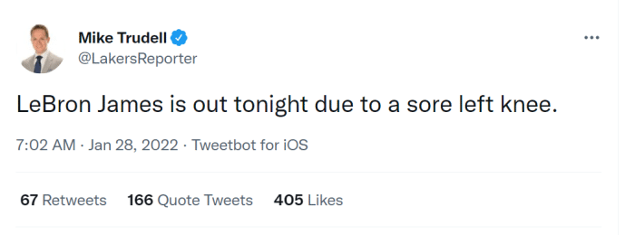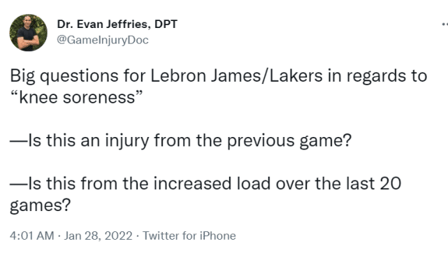 医学专家Evan Jeffries在社媒上表示:“湖人有背靠背要打,詹姆斯左膝酸痛缺战很正常,因为这可能是休息的代名词。我猜测不管他打不打,赛前都会热身测试一下。”不过,如果詹姆斯真的膝盖出现酸痛,那么詹姆斯上一次缺席比赛是在去年12月1日,他因新冠误诊而缺席了对国王的比赛。