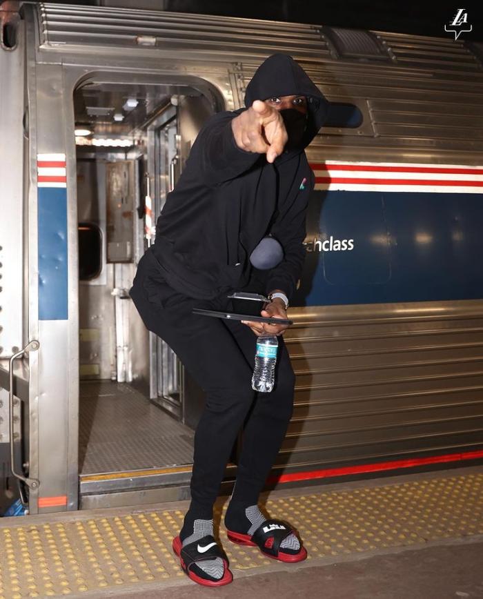 詹姆斯身穿一套深色的连帽运动装,穿着拖鞋坐在火车里,一手拿着手机,一手拿着矿泉水,冲着镜头露出歪嘴的霸气表情;对于詹姆斯的伤情,医学专家Evan Jeffries分析,湖人迎来背靠背,詹姆斯因膝盖酸痛被列为出战成疑,无论如何,他都会在赛前进行测试,我想如果他有任何的不适,他将不会参加比赛。