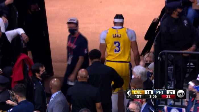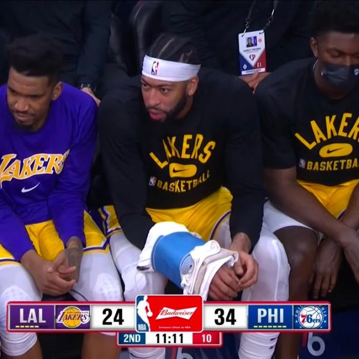 在一次进攻时,浓眉强突恩比德杀到禁区上篮,落地时摔伤手腕,当时浓眉坐在地板上捂着手腕十分痛苦,之后站起来,貌似伤势无大碍,带伤打了将近2分钟,浓眉被换下场;之后浓眉返回更衣室,检查手腕伤势,之后浓眉坐回替补席,伤势应该无碍。