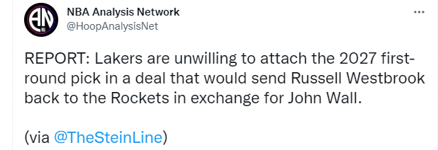 此前Marc Stein曾报道火箭愿意用沃尔换威少,并且向湖人索要2027年首轮选秀权,如今该记者再次爆料,Marc Stein表示,湖人队似乎已经下定决心至少在本赛季余下的时间里与威少并肩作战,他们将保留2027年首轮选秀权,寻找其他潜在的交易机会。