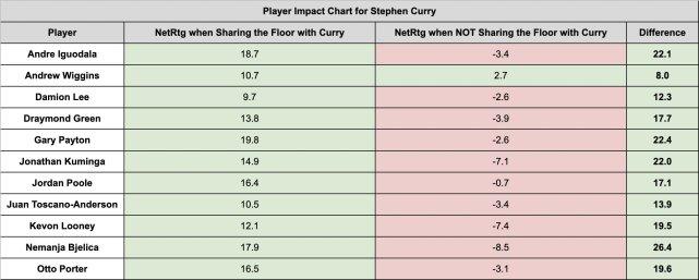 举个例子,伊戈达拉和库里同场时的效率差值是18.7,就是他和库里同场时,百回合能赢对手18.7分,他与库里不同场时效率差值是-3.4,就是当伊戈达拉在场而库里不在时,百回合要输给对手3.4分。二者之间的差别达到百回合22.1分!