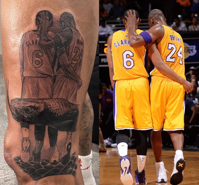 克拉克森的纹身有很多,其中不乏有艾弗森跨过泰伦卢的经典瞬间,不过作为前湖人球员,这样的行为也一度引发争议。而现在他将自己的恩师、前队友科比纹在身上,很暖心。