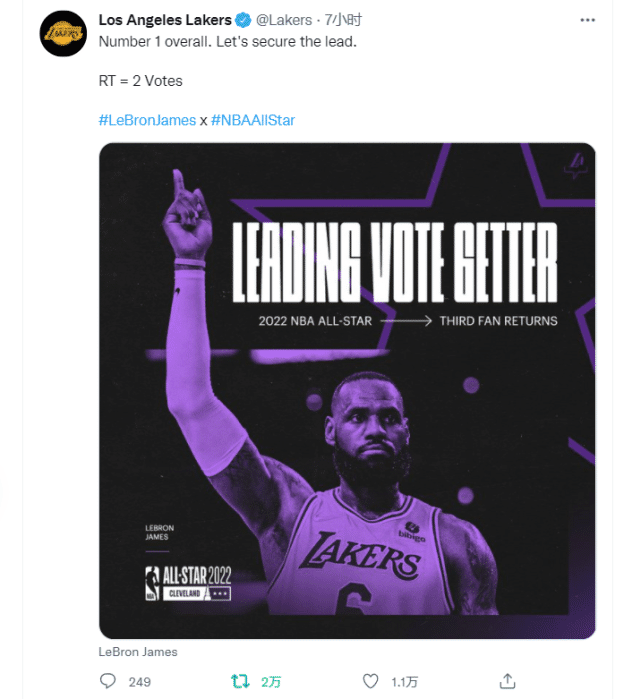 现在,詹姆斯极大可能连续第6年当选全明星票王,今天是最后一个双倍计票日,湖人官推再次为勒布朗拉票,可以看到已经有超过2万人转发推文,短短几小时又是4万+票进账!