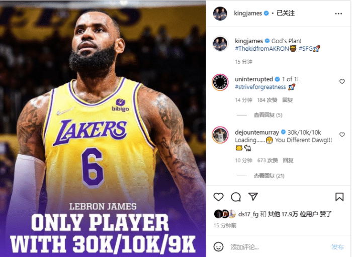 来源:24直播网01-21 10:3524直播网01月21日讯 ,湖人当家球星勒布朗-詹姆斯更新社交媒体,晒出自己创造的历史第一神迹,照片中配着詹姆斯是史上第一位30000分+10000篮板+9000助攻的球员,老詹写道:上帝的安排#来自阿克伦的孩子#追逐伟大。