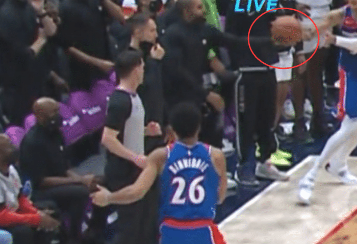 第四节2分09秒,奇才在边线的一次传球被场外的篮网助教范德普尔破坏了一下,当时,丁威迪传球给库兹马,范德普尔伸手碰了一下球,改变了球的飞行轨迹,球最后蹭到库兹马的手出界;裁判吹罚奇才出界违例,篮网获得球权!