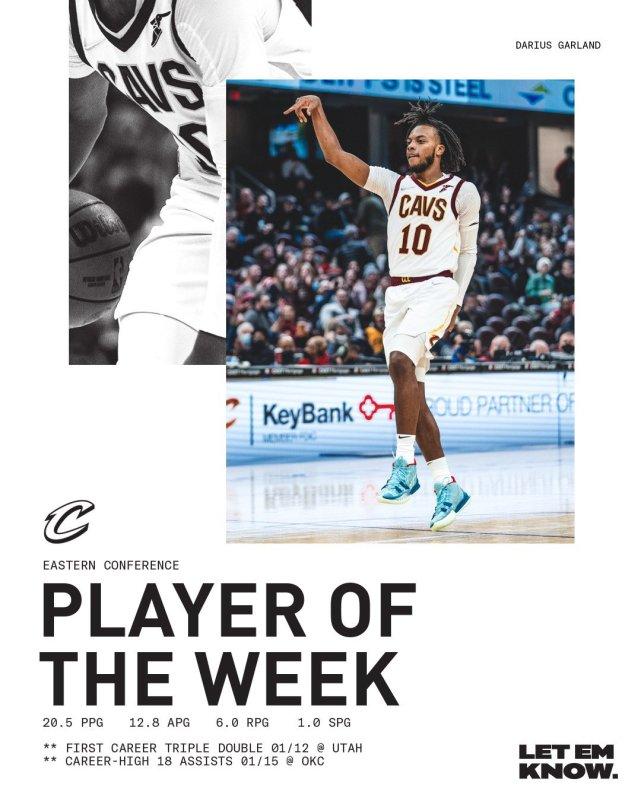 上周,加兰率领骑士获得4胜0负的佳绩,加兰场均贡献20.5分6篮板12.8助攻,投篮命中率43.5%。这是加兰生涯第一次当选周最佳,骑士官方晒图祝贺!