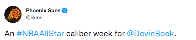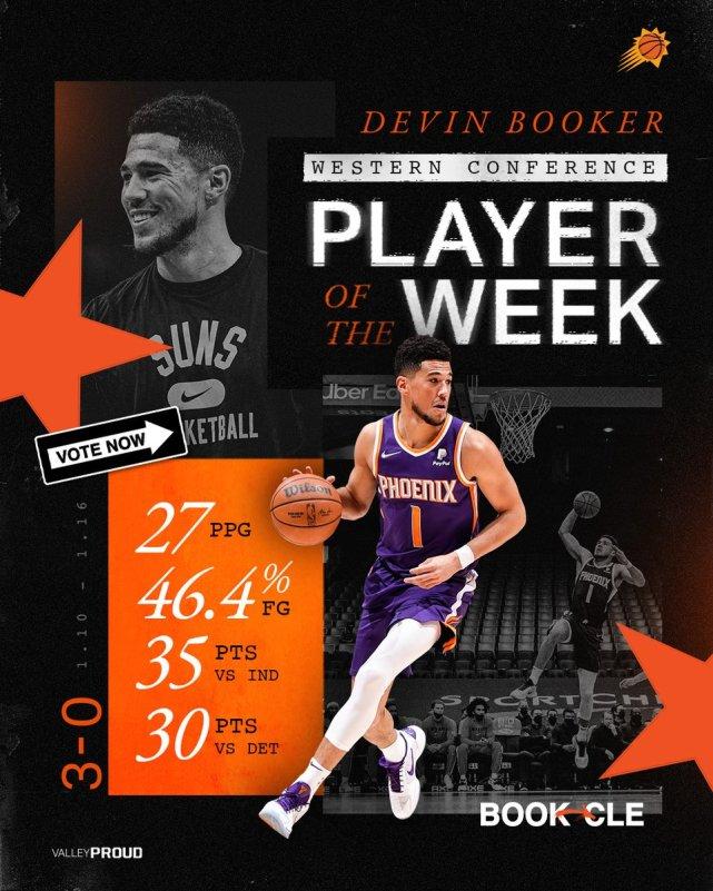 上周,布克率领太阳获得3胜0负的佳绩,布克场均贡献27分4.3篮板3.3助攻,投篮命中率46.4%。这是他本赛季第2次当选周最佳,生涯第5次获此殊荣,太阳官方晒图祝贺!
