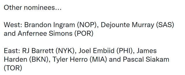 东部:巴雷特、恩比德、哈登、希罗、西亚卡姆