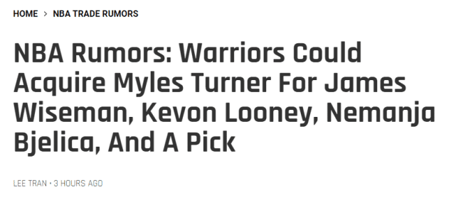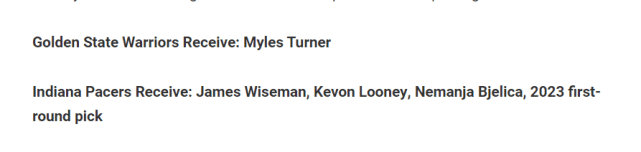此前有报道称,步行者交易特纳的要价已经曝光,他们希望得到两个首轮签或者一个首轮签+一个有前途的年轻球员。对特纳感兴趣的除了湖人,还有独行侠开拓者森林狼尼克斯黄蜂。勇士完全可以加入其中,他们的报价也很有竞争力,Fadeaway World列出了一笔4换1的方案,具体是勇士送出卢尼、怀斯曼、别利察和一个2023年的首轮签,从步行者换回特纳。