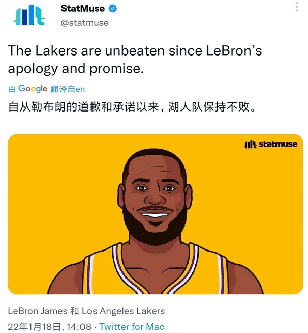 还有外媒调侃,称:自詹姆斯发文道歉和承诺以后,湖人保持不败。