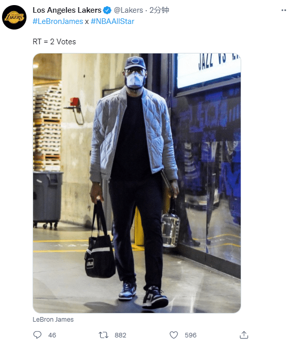 湖人官方晒詹姆斯入场照并且为老詹拉票,发推写道:#勒布朗-詹姆斯X全明星投票,1次转推等于两票。