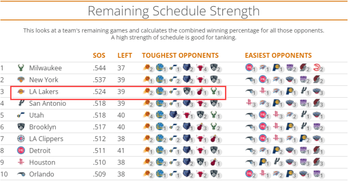 湖人下半程最难打的比赛有两战太阳,三战勇士,与爵士交手三次,勇士、太阳和爵士都排在西部前四;还要与篮网、热火以及雄鹿各对战一次,这三支球队都排在东部前四;换句话说,湖人剩余39场比赛,要面对东西部前四球队11次。