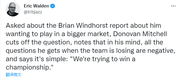 谈到为何在推特上点赞该言论时,米切尔沉默了几秒,然后表示:我们马上就要赢了,并且专注于防守。