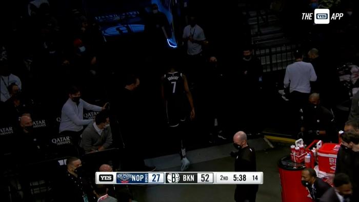 第二节5分多钟,杜兰特上场没多久就遭遇伤病,无意识被倒地的小布朗撞伤膝盖,之后杜兰特捂着膝盖,走到场边示意纳什喊暂停,之后杜兰特走回更衣室,如此伤病令人担忧。