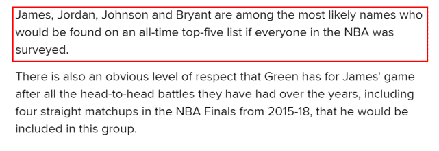 “如果对NBA的所有球员进行一次问卷调查,詹姆斯、乔丹、魔术师和科比应该是最经常出现在历史前五名单里的球员,”B/R写道。