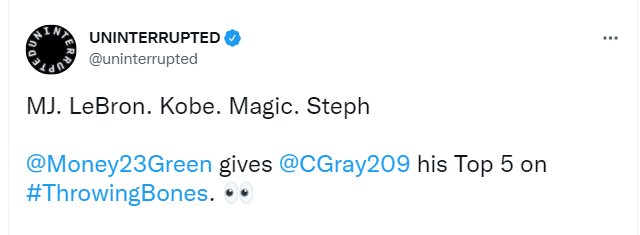 在节目上,追梦说道:“MJ(乔丹)、Bron(詹姆斯)……”一旁的嘉宾插话道:“我也会选Bron。”追梦继续说:“MJ、Bron、Kobe(科比)……顺便说一下,我不会说出那些并非来自我的时代的名字。比如,威尔特-张伯伦,我没见过张伯伦打球,所以我无法谈论。”一旁的嘉宾表示赞同,随后,追梦继续说道:“Magic(魔术师)和Steph(库里)。”追梦最后提到了队友库里,但嘉宾显然有些质疑。她说道:“啊……Steph?”