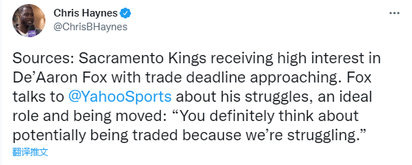 据海耶斯报道,国王队会考虑在交易截止日前送走队中后卫福克斯;随着交易截止日临近,不少球队对福克斯的兴趣浓厚。另有一些球队则有意哈利伯顿,尽管国王队没有非卖品,但国王队还是更倾向于留住这两位后卫。