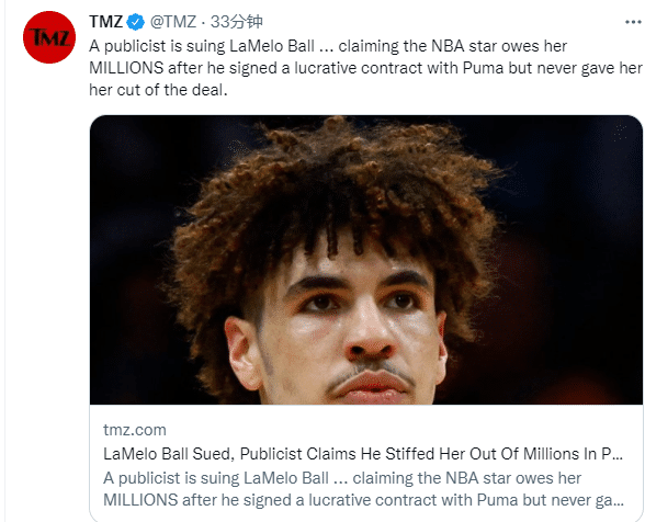 据TMZ报道,一位名叫Amber Johnson的公关人员正在起诉三球,声称其在与彪马签订了球鞋合同后欠她数百万美元。