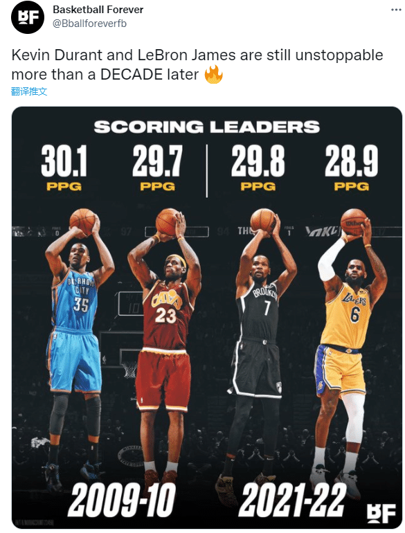 美媒Basketball Forever也晒出这组数据对比,发推写道:12年后,杜兰特和詹姆斯仍旧不可阻挡。