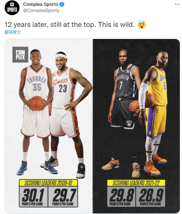 美媒Complex SPorts晒出杜兰特和詹姆斯两人12年前和现在的场均得分,发推写道:12 年过去了,他们仍然在最顶端,这太狂野了。