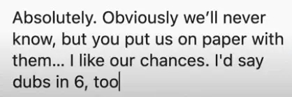 库里的答案是“绝对的。显然我们永远不会知道这轮系列赛的结果,但我很喜欢跟大家纸上谈兵,很喜欢大家给我们和他们对决的机会。我会说勇士六场拿下!”首先这样的假设是建立在两队所有人员都处在健康的情况下,而且库里也说了,这是纸上谈兵的答案,因为这种讨论本就没有答案!