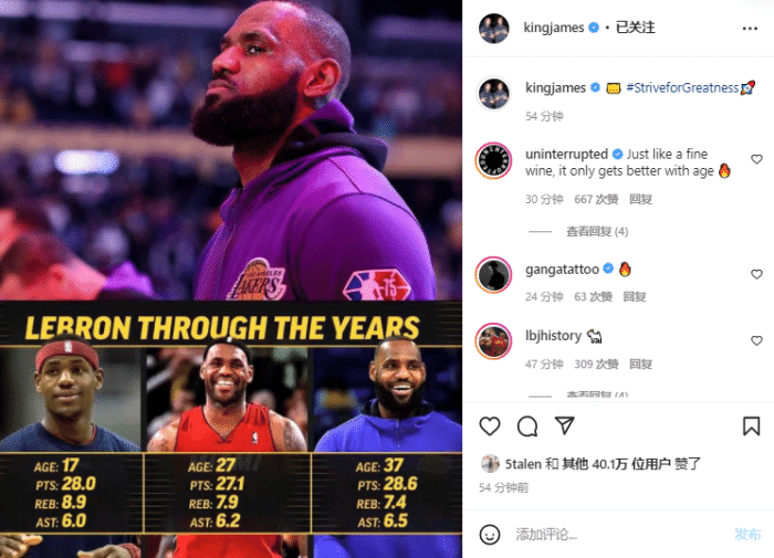 发推欢迎克莱复出!老詹晒生涯不同时期平框扣篮和数据:为伟大而奋斗
