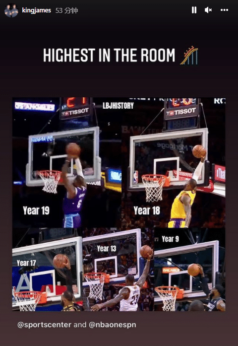 詹姆斯还晒出自己在5个不同时期的平框扣篮照,分别是第9年、第13年、第17年、第18年和第19年的平筐暴扣,这一画面也凸显出老詹演绎的不老神话;老詹配文写道:球馆的最高处。