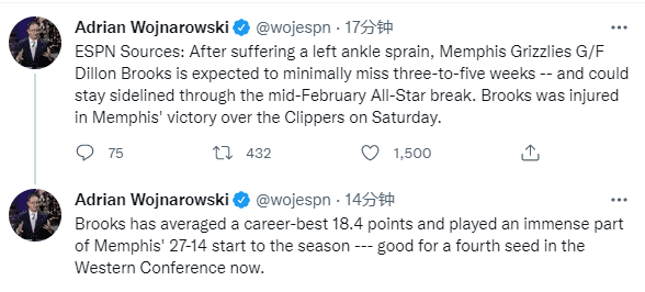 如今狄龙-布鲁克斯伤情确诊为左脚踝扭伤,至少伤停3-5周,确定缺席灰熊今天与湖人的比赛。