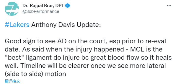 医学专家Rajpal Brar分析浓眉的情况,发推写道:在球场上看到浓眉训练是一个好兆头,尤其是在重新评估日期之前,可以看出他的韧带伤势愈合得很好。一旦我们看到他进行更多的横向(左右)运动,复出时期就接近了。