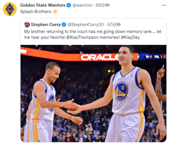 汤普森亲自宣布复出之后,库里十分激动,第一时间发推欢迎克莱复出,并且把推特头像换成了克莱的照片;勇士官方转发库里动态,配文写道:水花兄弟。
